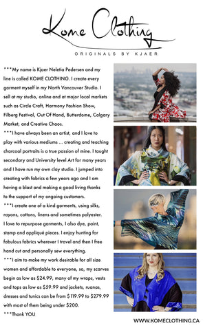 Kjaer makes everything in her North Vancouver Studio/Boutique. The designer enjoys repurposing garments, and also receives pleasure in free hand cutting chosen natural fabrics and often dying, painting, bleaching, stamping and appliquéing her work. The KOME Clothing line chooses fabrics carefully, her line consists a joyous array of reimagined clothing, along with an abundance of natural fibres including silk, wool, cotton, tencel and linen.